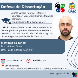 O Programa de Pós-Graduação em Medicina Veterinária Convencional e Integrativa (PPGMVCI) convida toda a comunidade acadêmica para prestigiar a sessão de defesa de dissertação do mestrando: